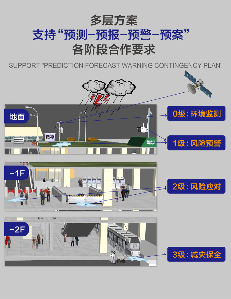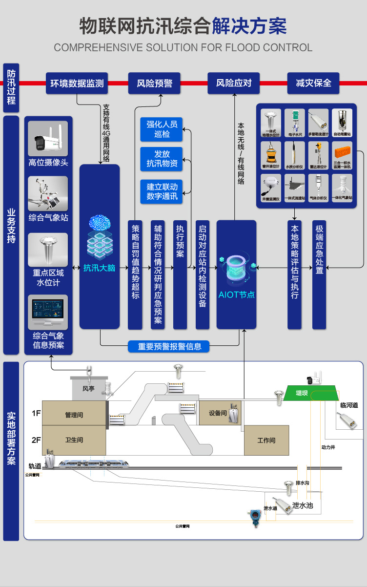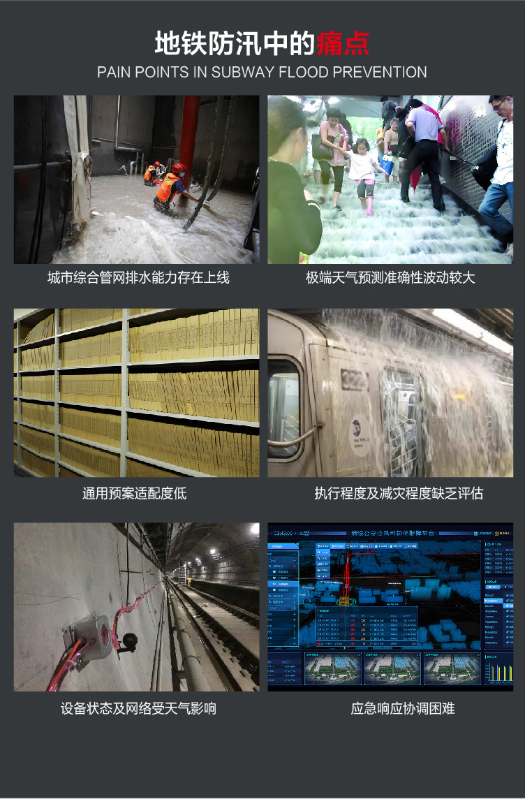 針對(duì)城市內(nèi)澇特點(diǎn),結(jié)合地鐵自身特點(diǎn)及相關(guān)事故數(shù)據(jù),特化構(gòu)建此綜合抗汛大腦。防汛大腦提供多源數(shù)據(jù)整合,提供包括氣象數(shù)據(jù)、物聯(lián)網(wǎng)監(jiān)測(cè)數(shù)據(jù)、過(guò)往業(yè)務(wù)處置數(shù)據(jù)、數(shù)字化應(yīng)急方案響應(yīng)機(jī)制等信息整合,構(gòu)建可視化“中心-站點(diǎn)-傳感器”一體化指揮駕駛艙,提升管理質(zhì)量及速率。
