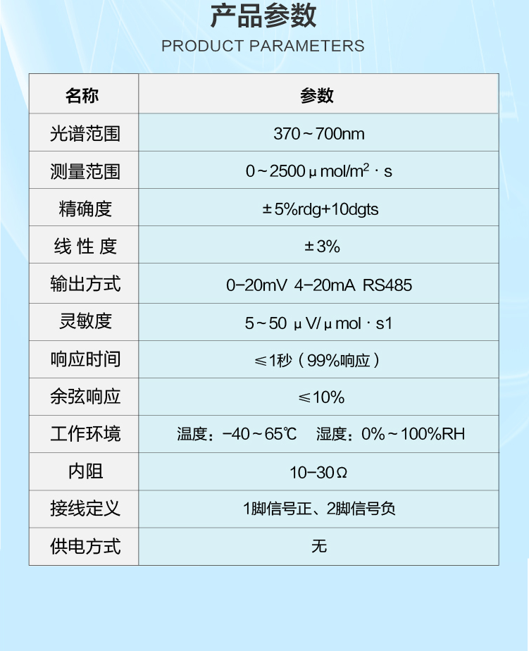 TBQ-5L光合有效傳感器,一款專為植物生長(zhǎng)與光合作用研究打造的高科技產(chǎn)品。它精準(zhǔn)測(cè)量并顯示不同光譜波段對(duì)植物光合作用的貢獻(xiàn),幫助研究人員和園藝愛(ài)好者深入了解植物對(duì)光照的響應(yīng)。產(chǎn)品特點(diǎn)顯著,擁有高精度光譜分析儀和實(shí)時(shí)數(shù)據(jù)記錄系統(tǒng),能夠迅速捕捉并解析光照變化對(duì)植物生長(zhǎng)的影響。適用范圍廣泛,無(wú)論是科研機(jī)構(gòu)的植物生理研究,還是溫室大棚的精準(zhǔn)光照管理,光合有效表都能提供有力支持,助力實(shí)現(xiàn)更高效、更科學(xué)的植物生長(zhǎng)調(diào)控。
