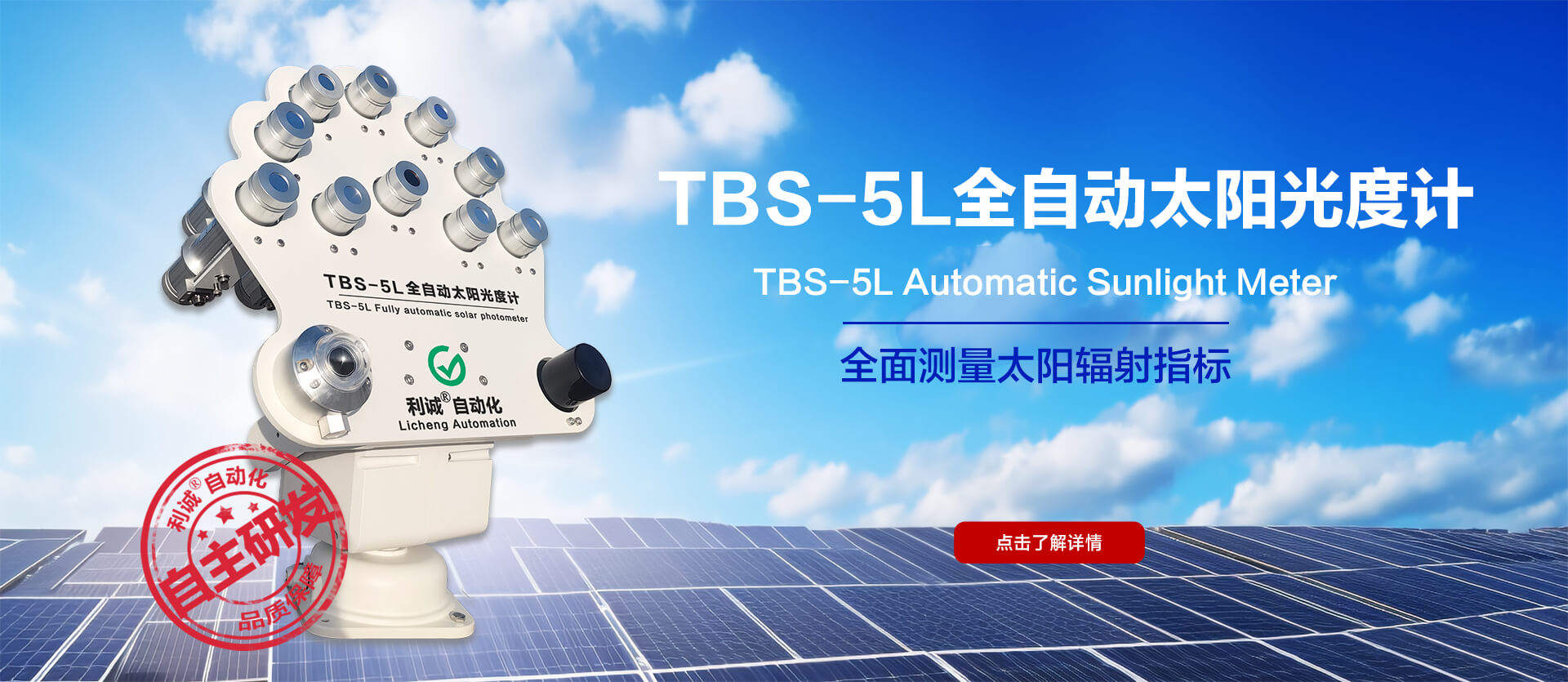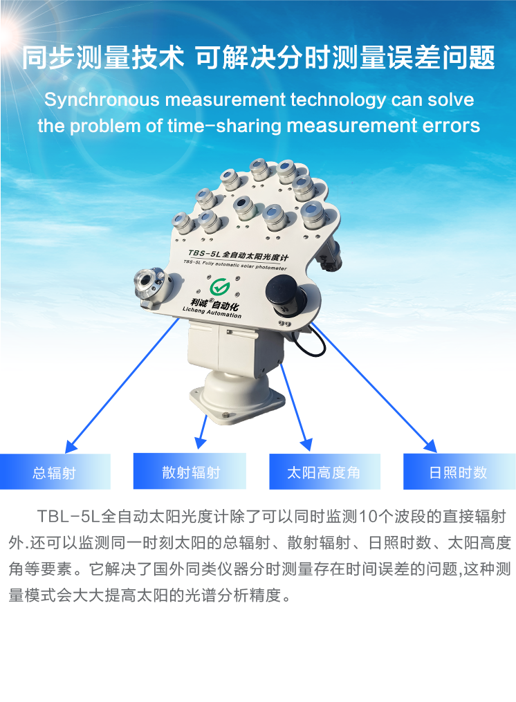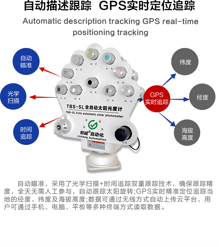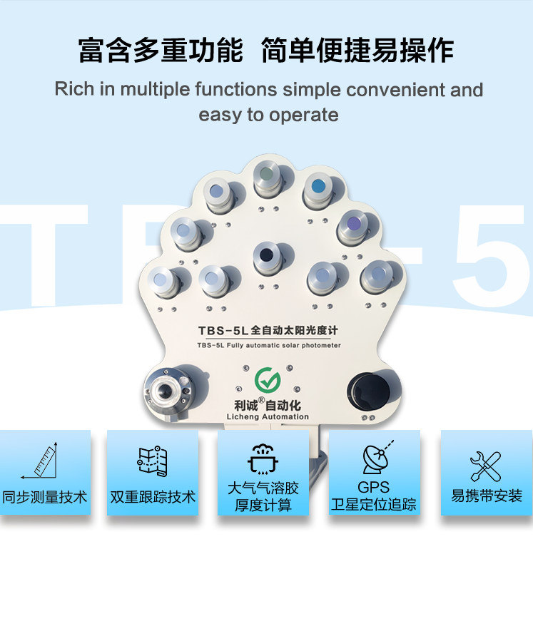 TBS-5L全自動太陽光度計為高精度野外太陽、天空輻射測量儀器,用于測量太陽和天空在可見光和近紅外的不同波段、不同方向、不同時間的輻射亮度,來推算大氣氣溶膠、水汽、臭氧等成分的特性;用于大氣環(huán)境監(jiān)測,衛(wèi)星校正等應(yīng)用。具有自動瞄準(zhǔn),太陽能供電,具有易攜帶安裝,可自動傳輸數(shù)據(jù)等特點;它是當(dāng)今應(yīng)用廣、功能全、權(quán)威性高的太陽光度計儀器。