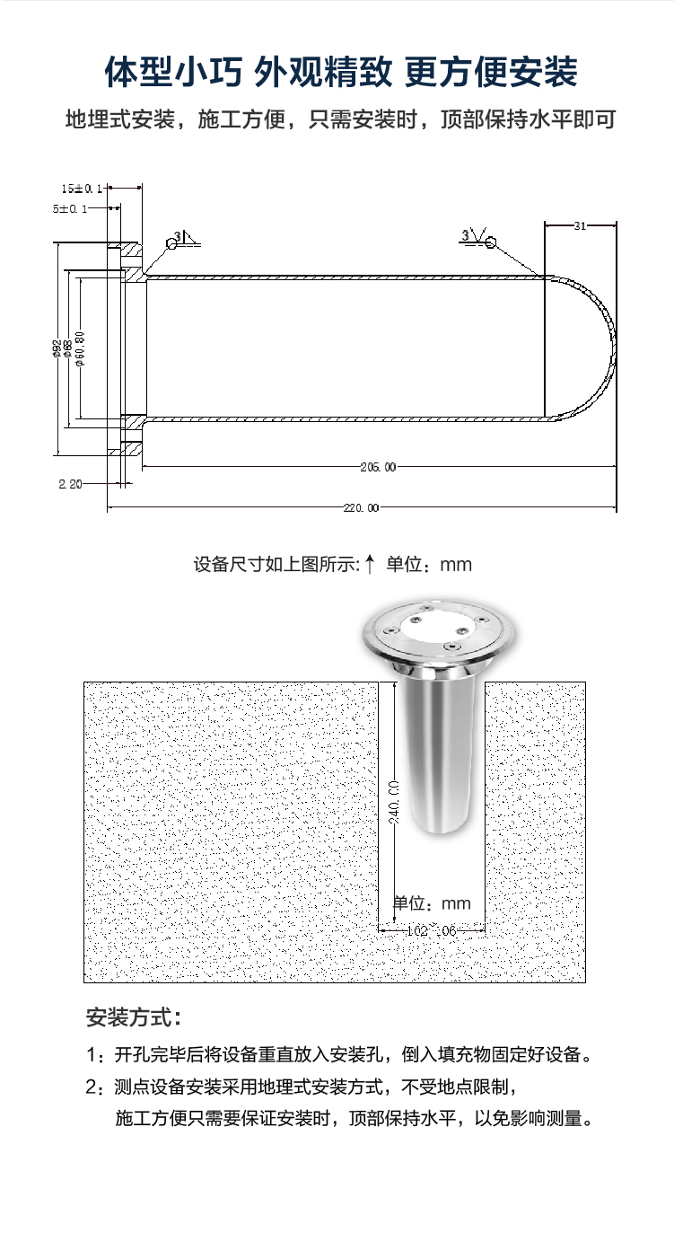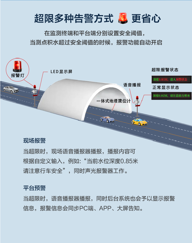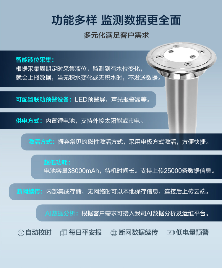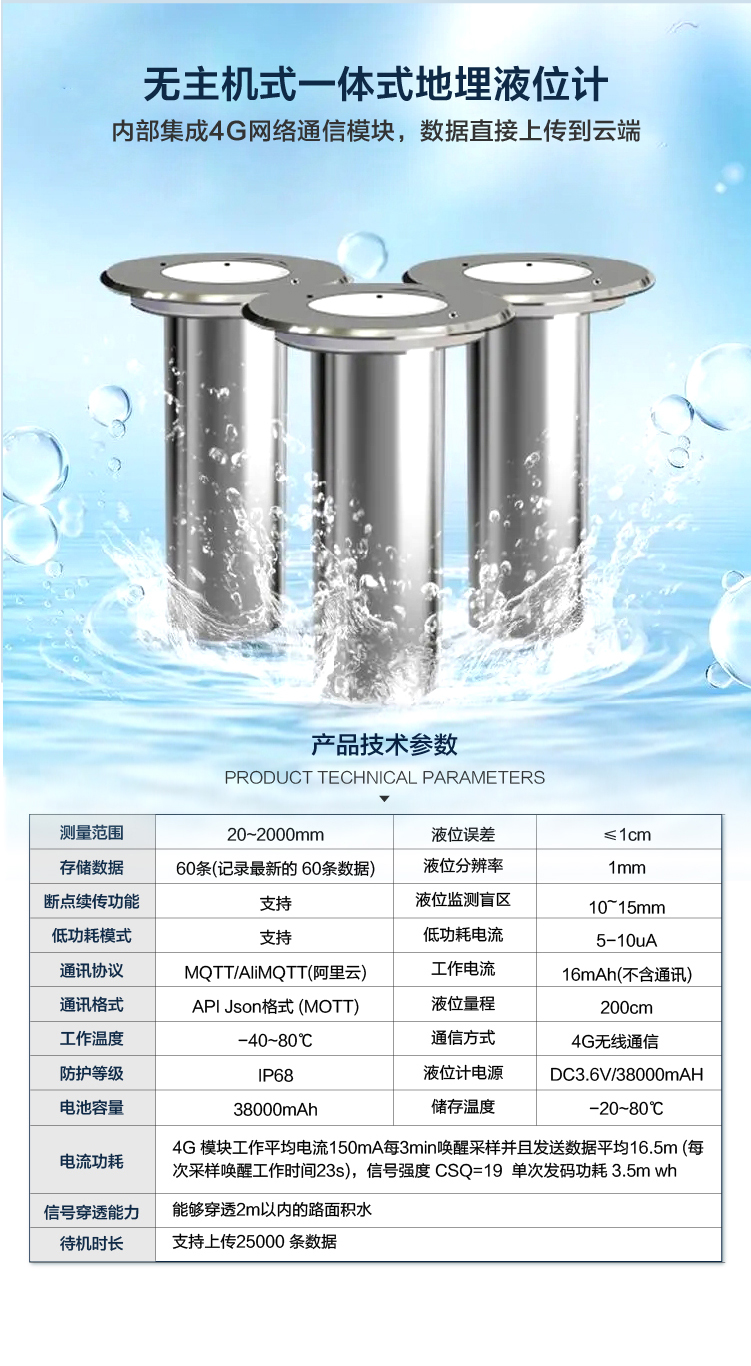 DC-JS3型一體式地埋液位計主要應(yīng)用于城市內(nèi)澇路面積水檢測領(lǐng)域,可實時監(jiān)測低洼路段的積水情況,保障城市建設(shè)的系統(tǒng)性和完整性。此產(chǎn)品無主機(jī)、內(nèi)部集成4G通訊模塊,可靠性高、功耗低、可擴(kuò)展性好、實用性強(qiáng),為城市防汛提供堅實的技術(shù)保證,有效幫助管理者了解實時積水實況,為城市防災(zāi)減災(zāi)指揮調(diào)度決策提供數(shù)據(jù)支持,為公眾出行提供方便,避免公眾生命財產(chǎn)遭受損失。