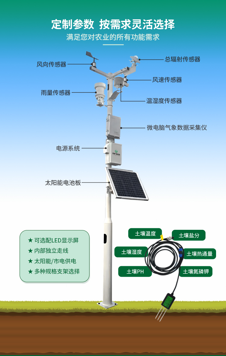 智慧農(nóng)業(yè)監(jiān)測氣象站作為現(xiàn)代農(nóng)業(yè)管理的得力助手,集成了高精度傳感器和先進的數(shù)據(jù)分析系統(tǒng),能夠實時監(jiān)測和記錄溫度、濕度、風速、風向、降雨量等關鍵氣象數(shù)據(jù)。這款產(chǎn)品不僅為農(nóng)業(yè)生產(chǎn)提供了科學的決策依據(jù),有效預防氣象災害對農(nóng)作物的威脅,還能幫助農(nóng)民優(yōu)化種植方案,提高產(chǎn)量和品質。無論是大型農(nóng)場、農(nóng)業(yè)合作社,還是個體農(nóng)戶,農(nóng)業(yè)氣象站都能發(fā)揮其獨特的價值,助力農(nóng)業(yè)生產(chǎn)的現(xiàn)代化、智能化和精準化。